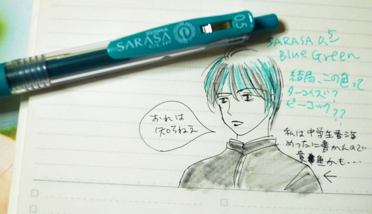 絵を描く目的では使いませんが、何色か持っているSARASAというボールペンに「ブルーグリーン」という色名があるのを知って、名前に釣られて買いました。