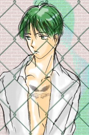 檻っていうか、金網(の柄)違いの絵です。 そして、金網越しにしか春海が見えない構図にしています。