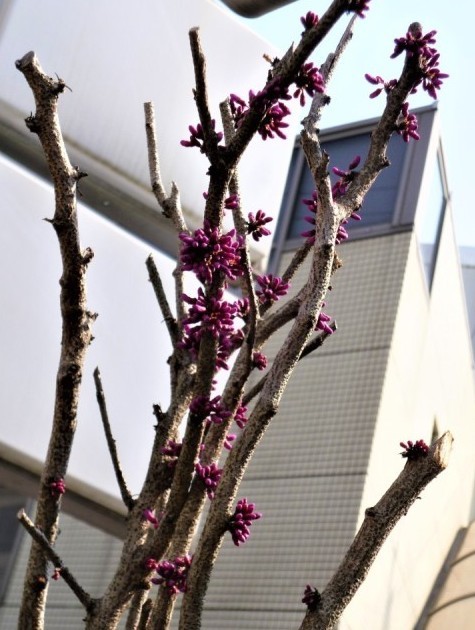 高く高く伸びた枝をすっかり切り取られて、今年の春は復活無理じゃないの? と思っていた近所のたった一本のハナズオウ。