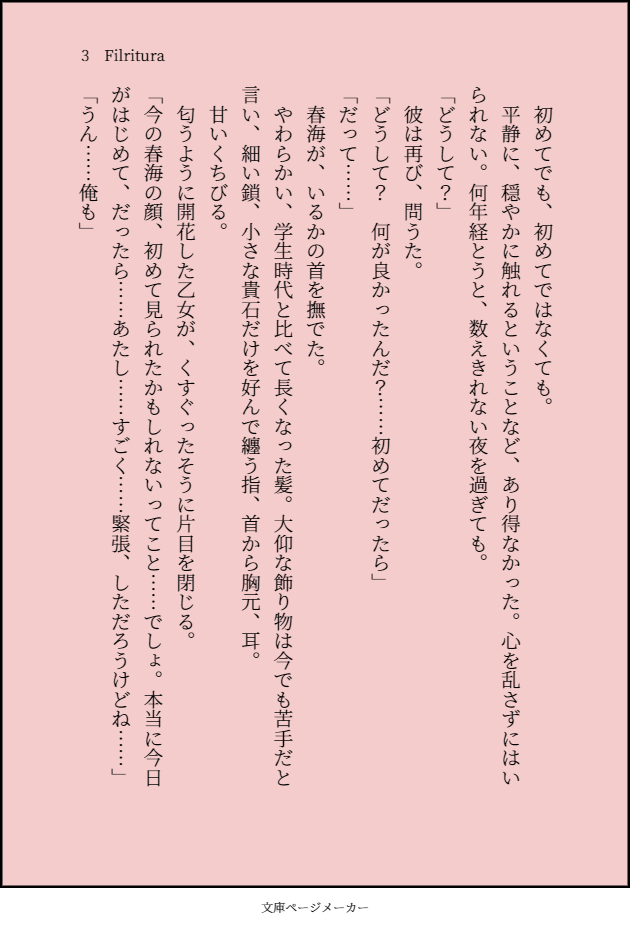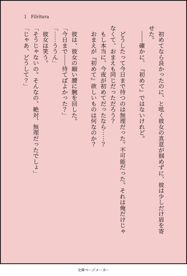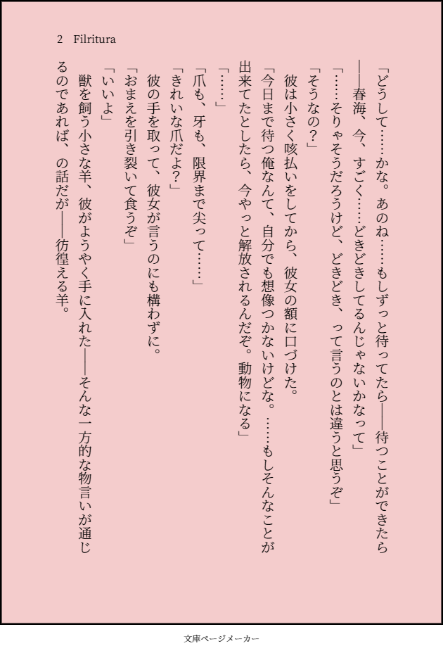 激しくポエム、激しく自家発電、激しく自分絵(らくがきレベル)。突然、時系列をワープする無節操さ、唐突なファンタジー設定、微妙にR18要素あり。